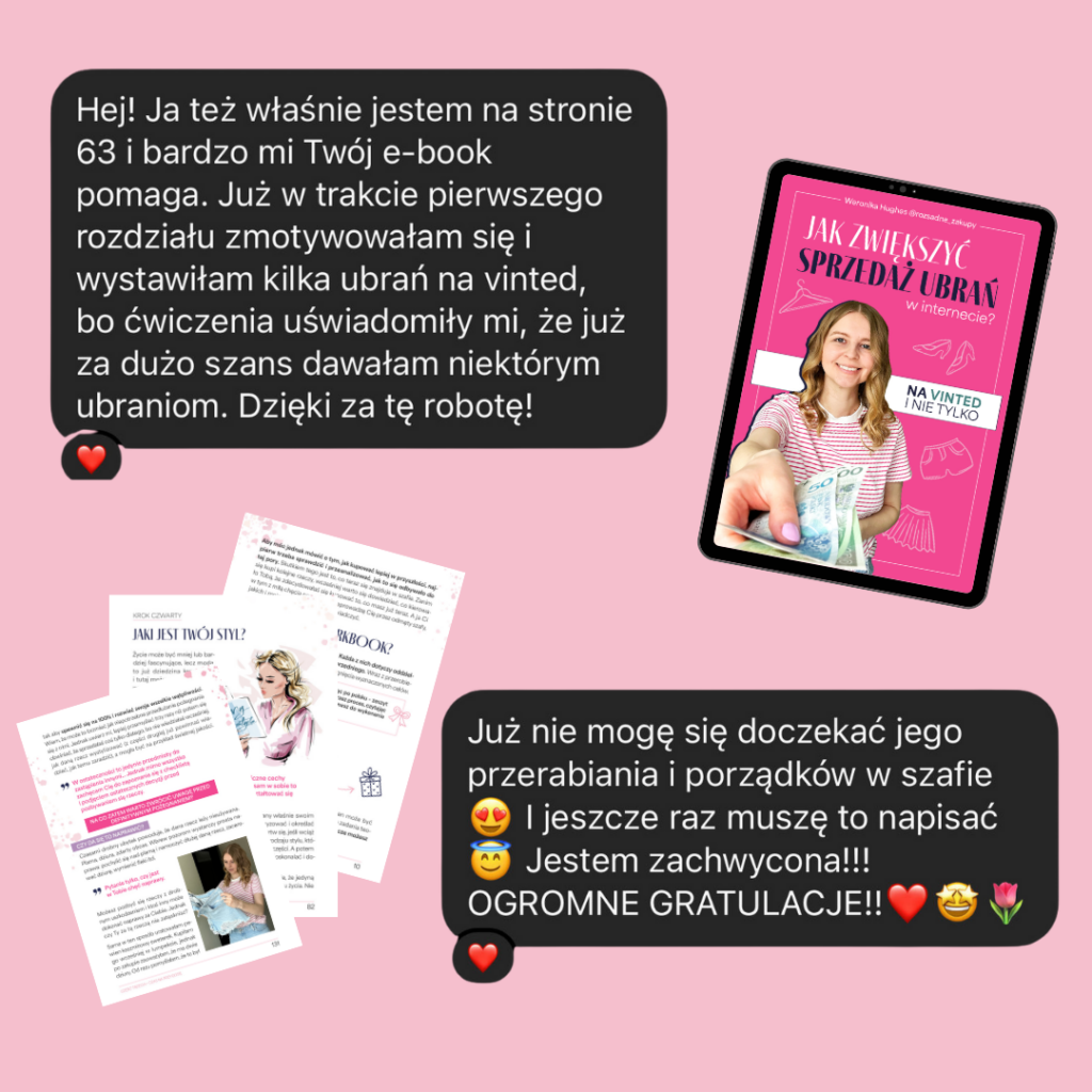 Na koniec na niechcianych ubraniach możesz jeszcze zarobić. A jeśli nie wiesz jak lub sprzedaż to nie Twój konik, to w wersji PREMIUM przygotowałam Ebook – Jak zwiększyć sprzedaż ubrań w internecie? Na Vinted i nie tylko, który Ci tę sprzedaż ułatwi i podbije.