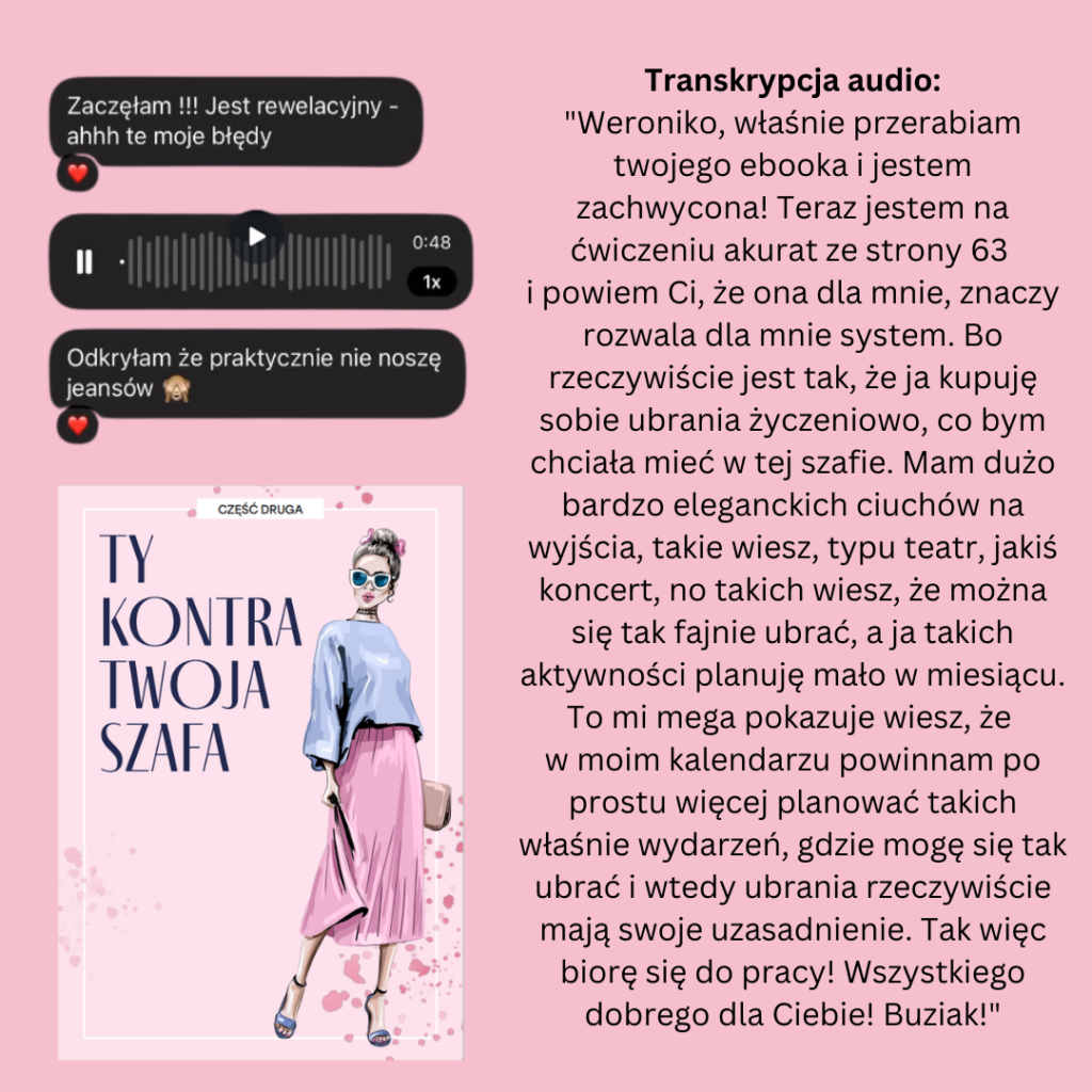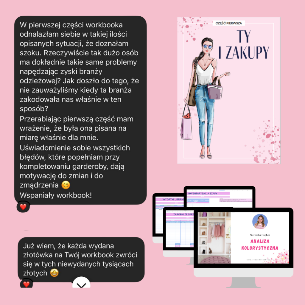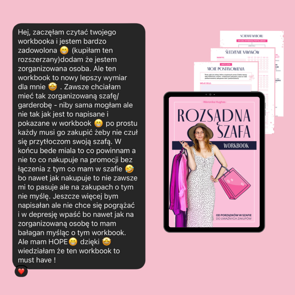 Powodem jest to, iż swoje treści kieruję głównie do damskiej części publiczności. 97% moich Obserwujących na Instagramie to kobiety. Dlatego to z myślą o nich zwracam się w formie żeńskiej. Natomiast jeśli Ty należysz do grupy pozostałych 3% i jesteś zainteresowany zakupem, to miej na uwadze to, że formy męskiej w workbooku nie uświadczysz. Jednak treści nadal mogą być pomocne również i dla Ciebie. W końcu i kto nie chce mieć się w co ubrać?!